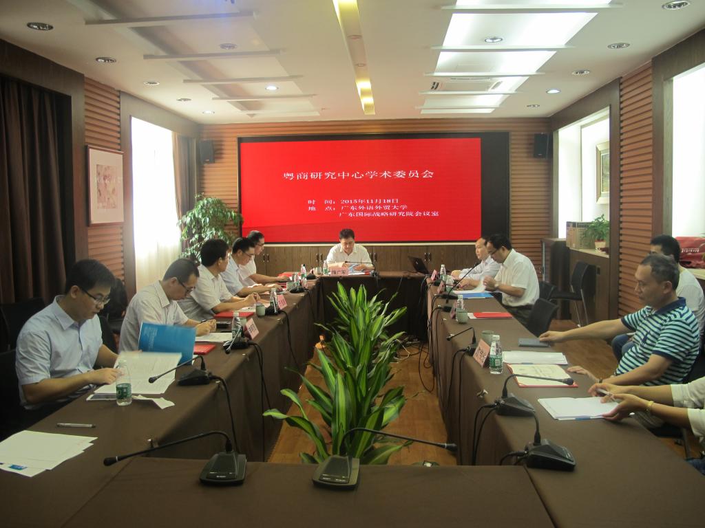 2015年11月18日,粤商研究中心在我校广东国际战略研究院三楼会议室召开第三届学术委员会会议。广东外语外贸大学党委书记隋广军教授、副校长阳爱民教授、新一届学术委员会全体委员及中心研究员出席了本次会议。